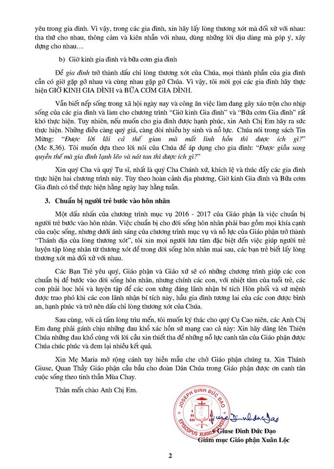 Cùng với Hội Thánh trên toàn thế giới, chúng ta bước vào Mùa Chay Thánh, bắt đầu từ Thứ Tư Lễ Tro. Nhân dịp này, tôi xin gửi đến mọi người, mọi gia đình, cộng đoàn dòng tu, giáo họ, giáo xứ; đến các con cái Giáo phận đang đi làm, đi học nơi xa hoặc định cư ở nước ngoài và những anh chị em di dân đang cư ngụ trên mảnh đất Giáo phận, lời thăm hỏi yêu thương và lời nguyện chúc chân thành: Nguyện xin Thiên Chúa, nhờ lời bầu cử của Mẹ Maria và Thánh Giuse Quan Thầy Giáo Phận, thương xót mọi người, đồng thời ban cho chúng ta ơn canh tân cuộc sống, ơn sống an bình với Chúa, với tha nhân và với chính lương tâm của mình....