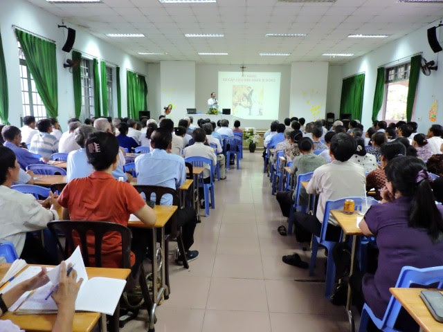 Bài khóa đầu tiên, các học viên được Đức ông TĐD hướng dẫn chủ đề ngũ niên mừng kim khánh thành lập giáo phận và những công việc sắp tới, hướng đến cử hành năm thánh của giáo phận từ tháng 10/2014 đến tháng 10/2015.